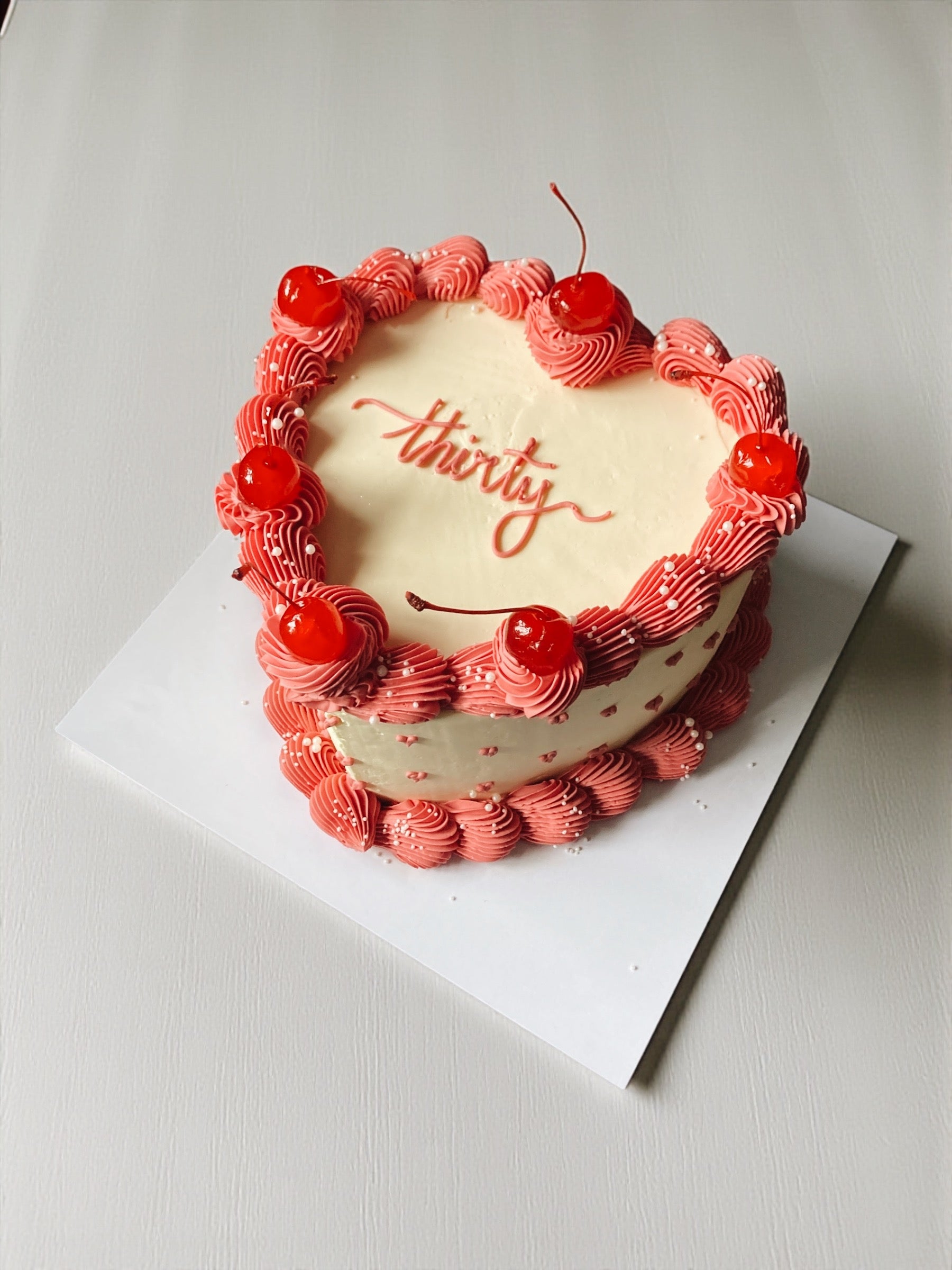 A heart cake with vintage piping. Customise with your favourite colours, flavour, size and personalised message